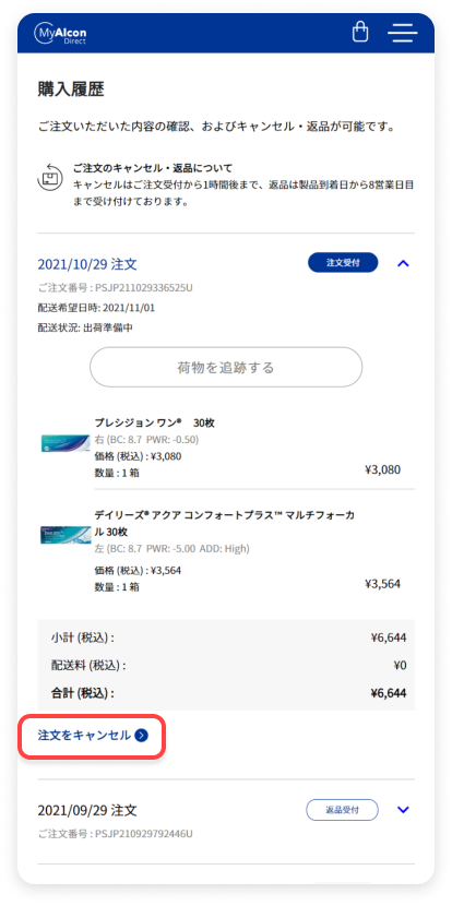 購入履歴上”キャンセル“ボタンが表示されておりクリックできる場合は、キャンセルができます。クリックできない場合はキャンセルはできません。その場合は、製品が到着後返品手続きを行ってください。詳しくは、ご利用ガイド「返品方法」をご確認ください。