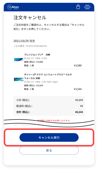 内容確認画面が表示されますので、「キャンセル実行」をタップすると、キャンセル完了となります。