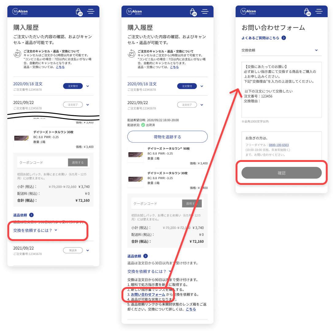 お問合せ内容が自動入力されますので、必要に応じて交換理由などを追記いただき、確認をタップ後に送信してください。