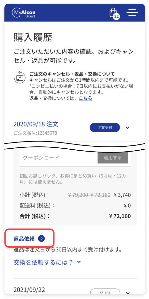 交換の申請が受理された後に、購入履歴の該当の注文の履歴にアクセスすると、「返品依頼」ボタンが表示されます。