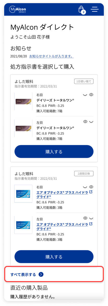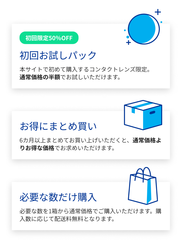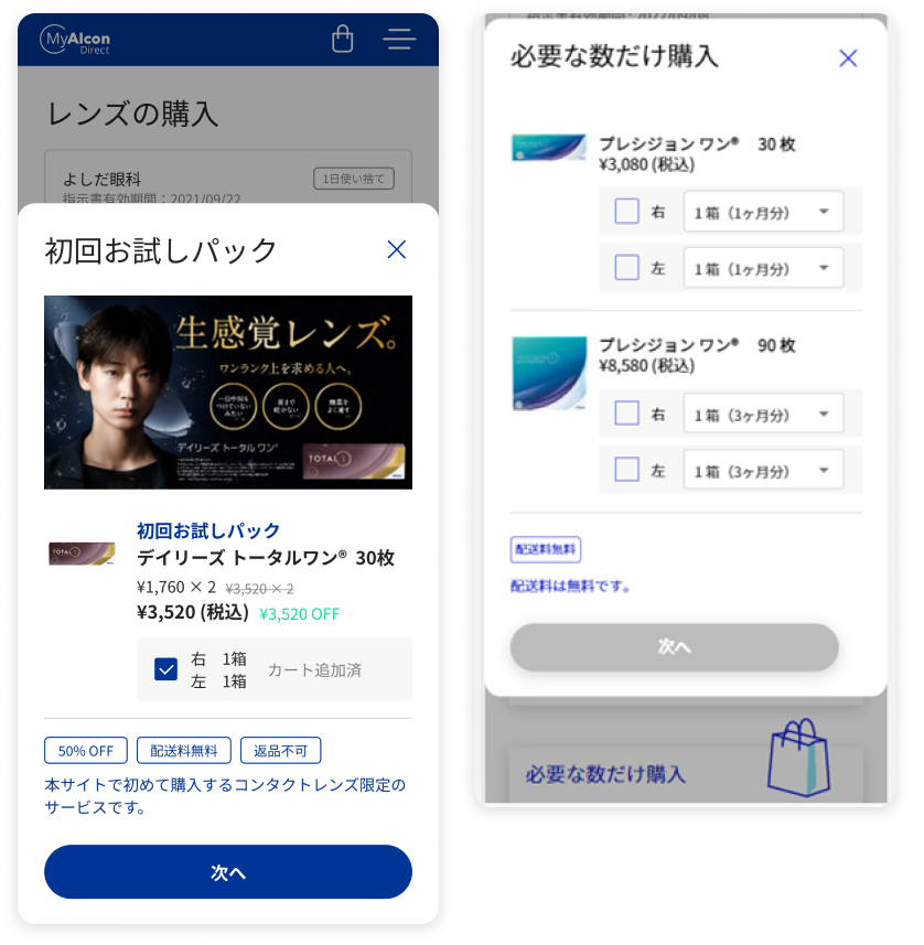 お試しパックは、購入箱数が片眼につき1箱(両眼で2箱まで)になります。変更できません。