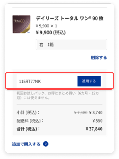 クーポンをお持ちの場合は、コードを入力し、適用するを選択してください。