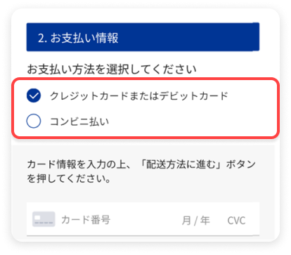 クレジットカード、デビットカード、またはコンビニ払いを選択して、必要な情報を入力してください。